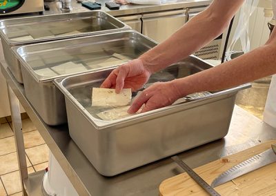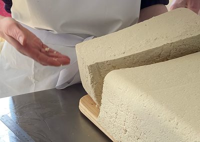 - Pressage du tofu : Le petit lait est extrait et le tofu est mis dans un moule où il est pressé pour lui donner sa forme.